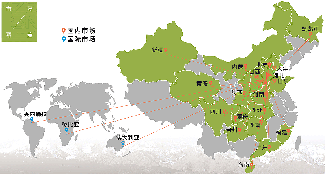 業(yè)務(wù)輻射——國內(nèi)的華北五省區(qū)市、西北新疆、青海及河南、山西、山東、福建、廣東、海南等地,海外業(yè)務(wù)延伸至澳大利亞、贊比亞、委內(nèi)瑞拉等國家,